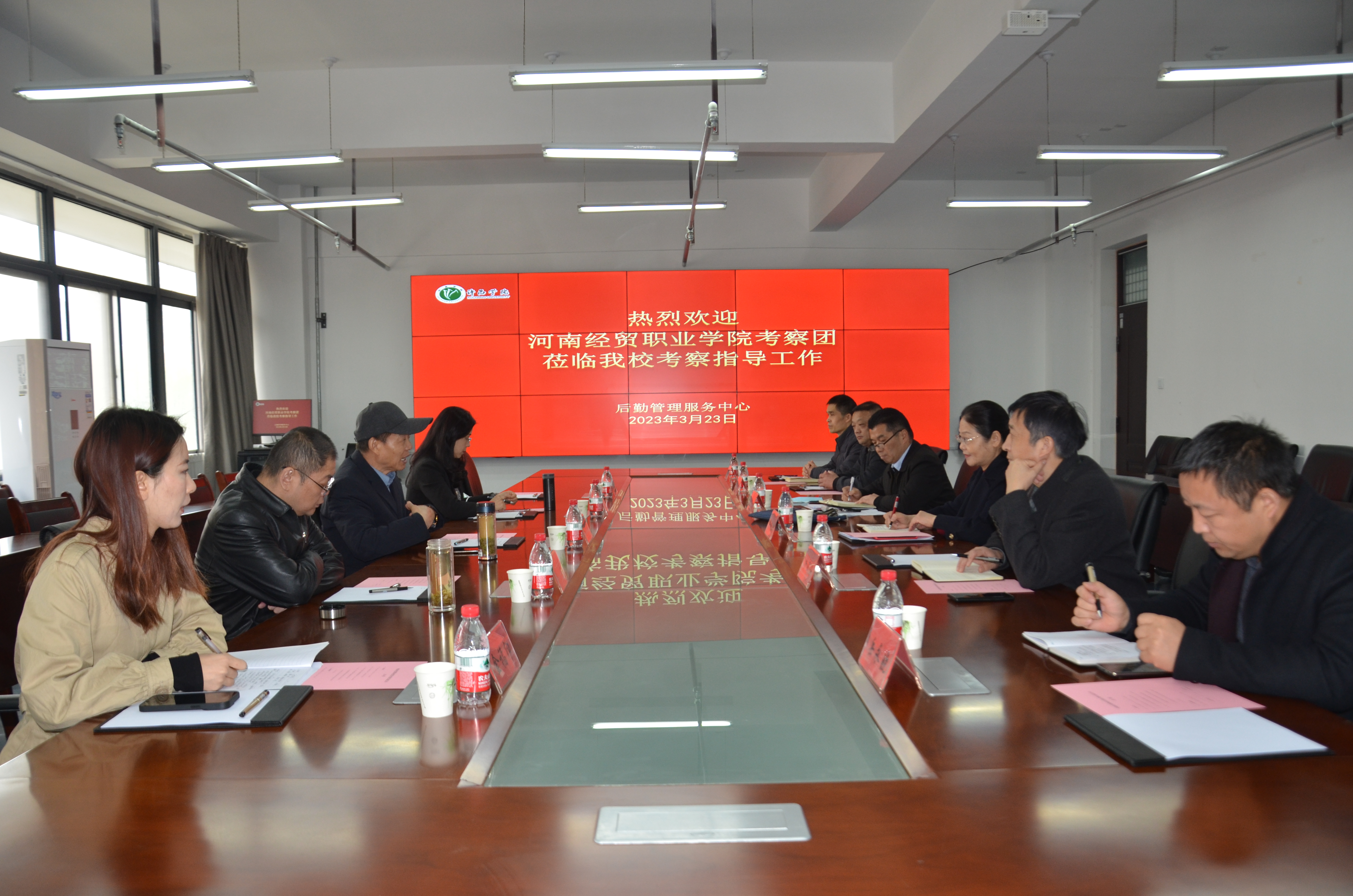 3月23日上午,河南经贸职业学院副校长高庆新带领相关部门负责同志一行5人来金沙官网考察交流。金沙官网在教师活动中心303会议室召开座谈交流会。副院长潘春彩出席会议,国有资产管理处、后勤管理服务中心负责人参加座谈交流。座谈会由后勤管理服务中心主任刘军伟主持。