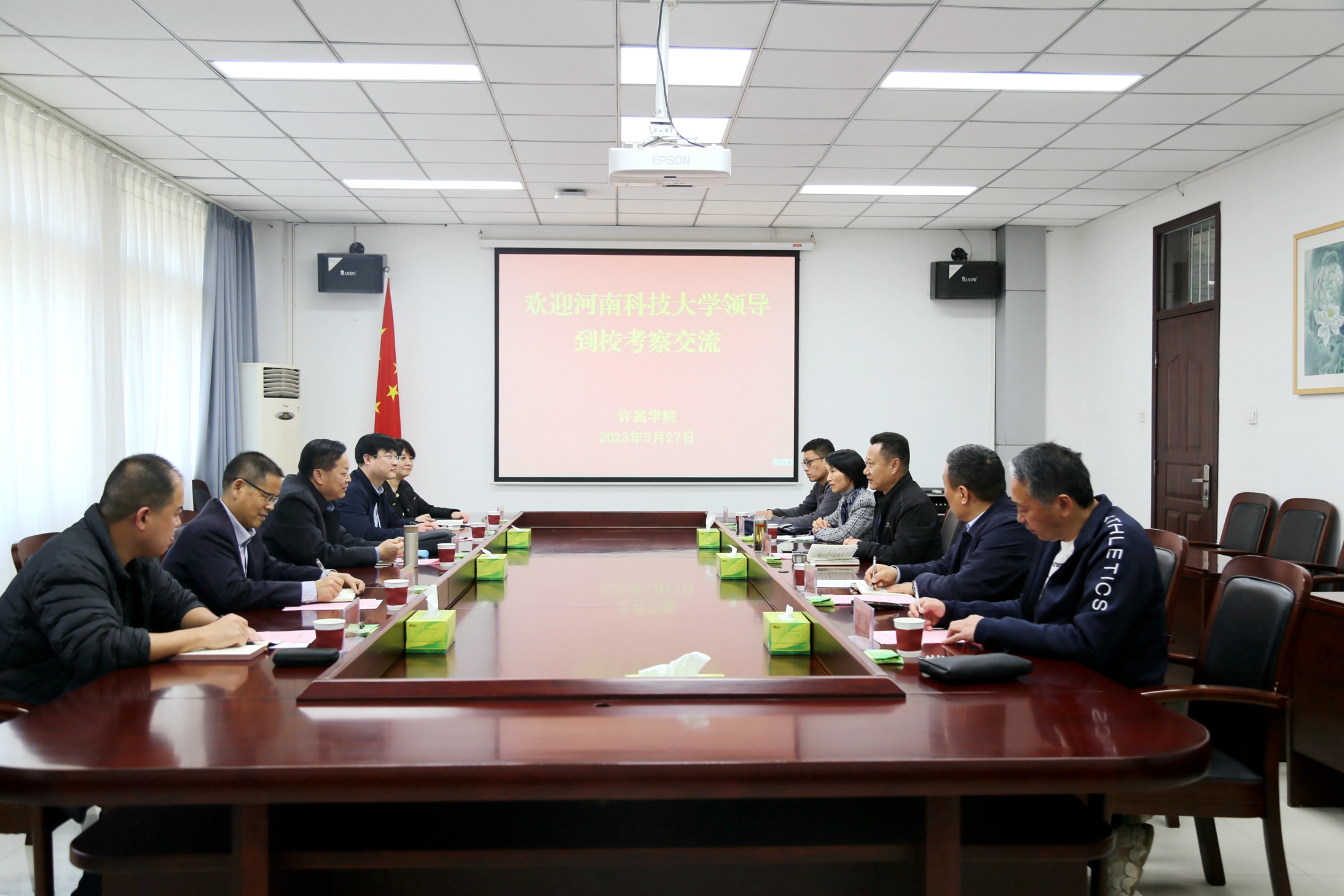 3月27日下午,河南科技大学党委副书记孟伟一行5人来金沙官网考察交流。金沙官网党委书记郭涛、党委副书记孙海在办公楼贵宾室会见了孟伟一行。副院长潘春彩陪同考察。