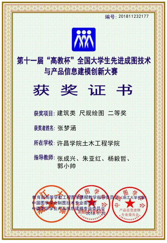 近日,第十一届“高教杯”全国大学生先进成图技术与产品信息建模创新大赛在南京工业大学落下帷幕。金沙官网土木工程学院张成兴、朱亚红等老师指导的2名学生参加了本次比赛,其中张梦涵同学在建筑类尺规绘图单项竞赛中获得二等奖的好成绩。